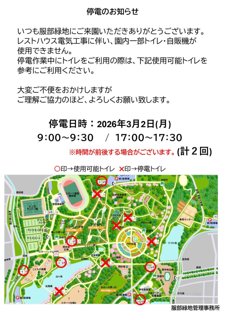 いつも服部緑地にご来園いただきありがとうございます。電気工事に伴い、園内一部トイレ・自販機がご利用いただけませんのでお知らせいたします。