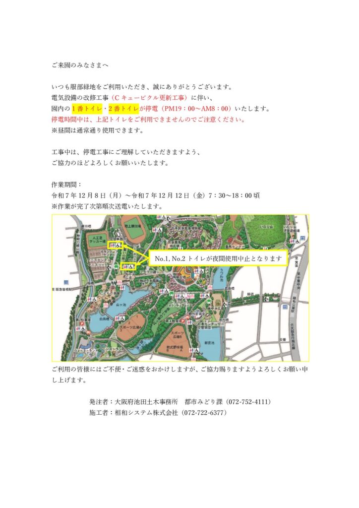 大阪府発注 園内電気工事にともない、夜間作業中は1番トイレ・2番トイレが使用できませんので