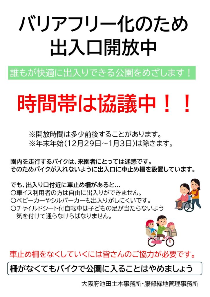 園内出入口はバリアフリー化のため、終日開放しておりますが、昨今 、園内にバイクの乗り入れ事案が多く報告されております。その件に伴い、夜間は車止めを設置し 第一駐車場出入口を一部封鎖することになりました。