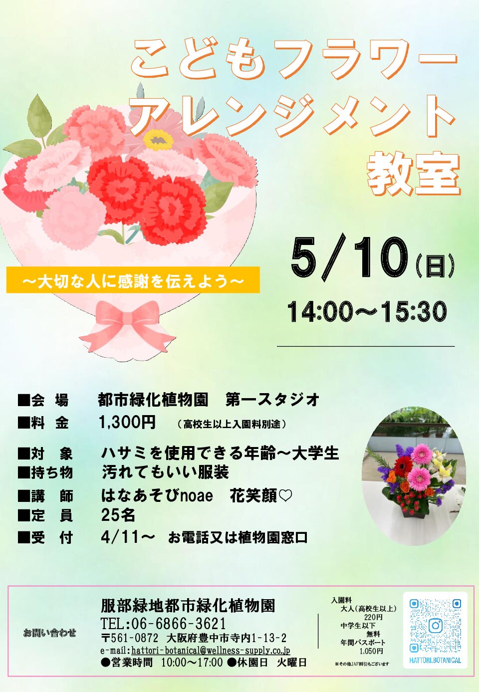 大人気の子どもフラワーアレンジメント教室開催!! 【日 時】5月10日(日)14時00分~15時30分 【会 場】服部緑地都市緑化植物園 第一スタジオ 【対 象】はさみの持てる年齢~小学六年生 【参加費】1,300円 (...