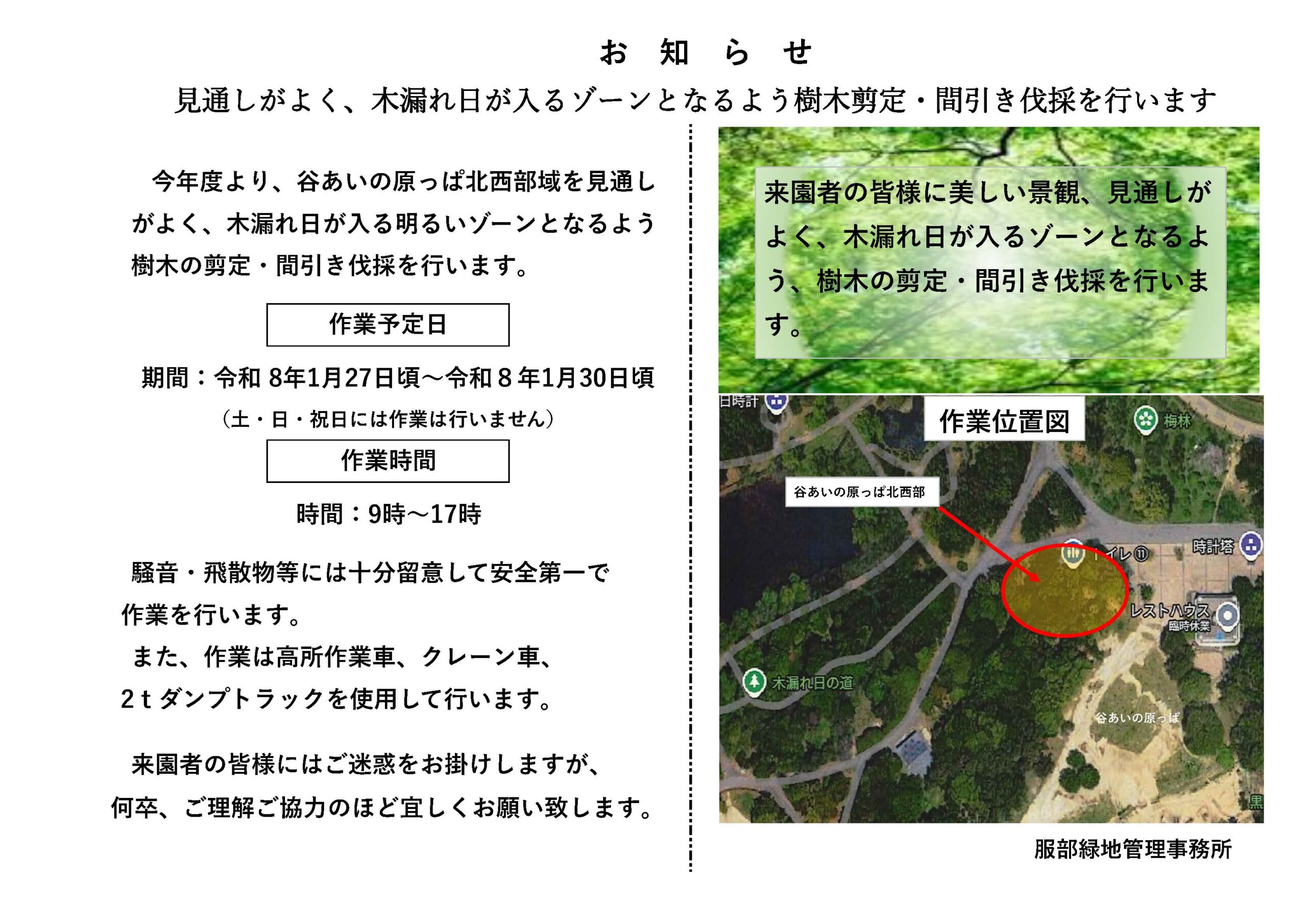 今年度より、谷あいの原っぱ北西部域を見通しがよく、木漏れ日が入る明るいゾーンとなるよう、樹木の剪定・間引き伐採を行います。 作業予定日:期間:令和 8年1月27日頃~令和8年1月30日頃(土・日・祝日には作業は行いませ...