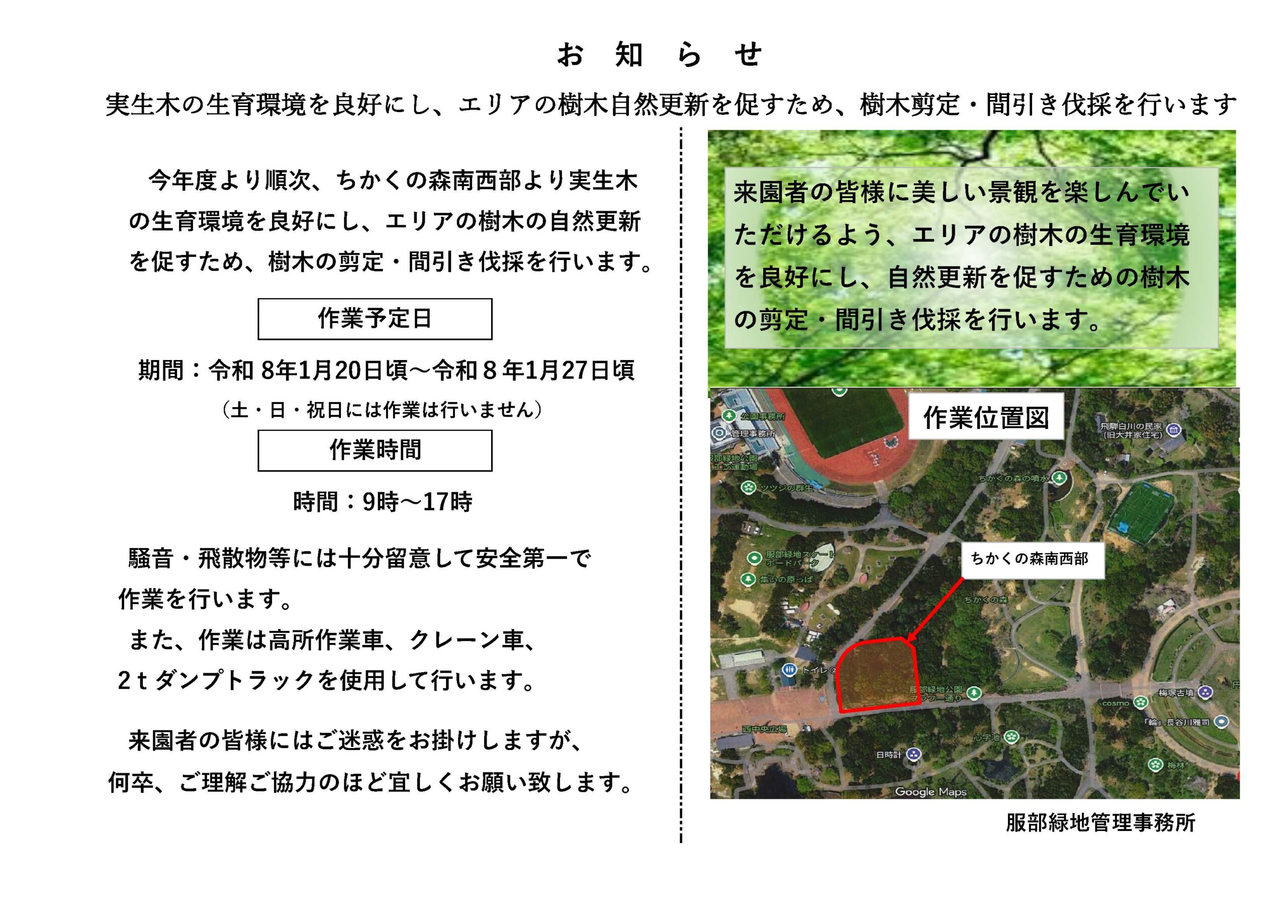 今年度より順次、ちかくの森南西部より実生木の生育環境を良好にし、エリアの樹木の自然更新を促すため、樹木の剪定・間引き伐採を行います。 作業予定日:期間:令和 8年1月20日頃~令和8年1月27日頃(土・日・祝日には作業...