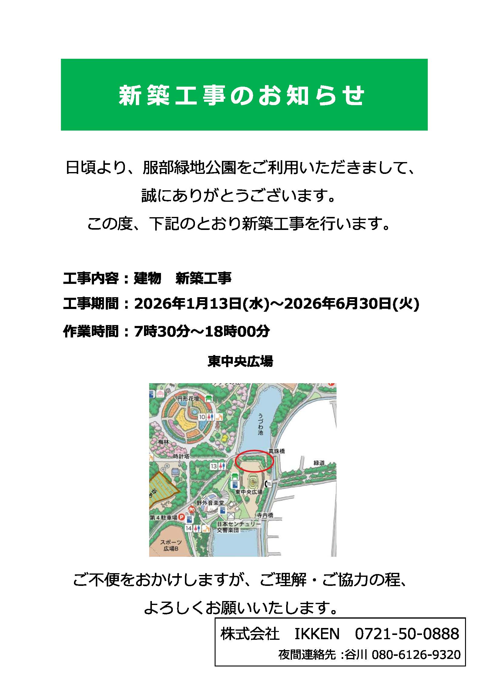 日頃より、服部緑地をご利用いただきまして、誠にありがとうございます。 この度、下記の通り新築工事を行います。 工事内容:建物 新築工事 工事期間:2026年1月13日(水)~2026年6月30日(火) 作業時間:7時30...