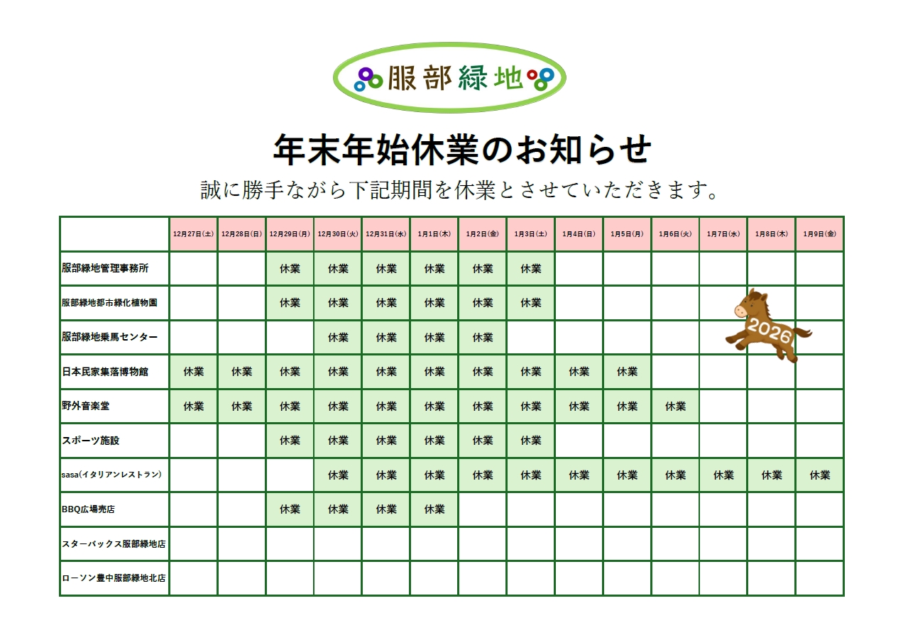 いつも服部緑地をご利用いただき、誠にありがとうございます。年末年始は下記のとおり休業させていただきます。 ※児童遊戯場・園路につきましては、年末年始期間も通常通りご利用いただけます。 ※詳細は各施設にご確認ください。 休...