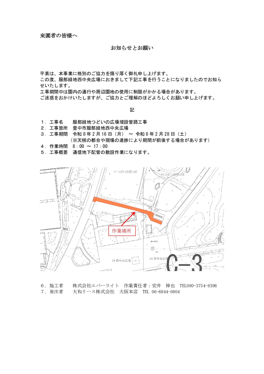 いつも服部緑地にご来園いただきありがとうございます。 この度、配線工事を行いますのでお知らせいたします。 工事名:服部緑地つどいの原っぱ埋設管路工事 工事箇所:西中央広場~集いのはらっぱ間(休憩所周辺) 工事期間:202...