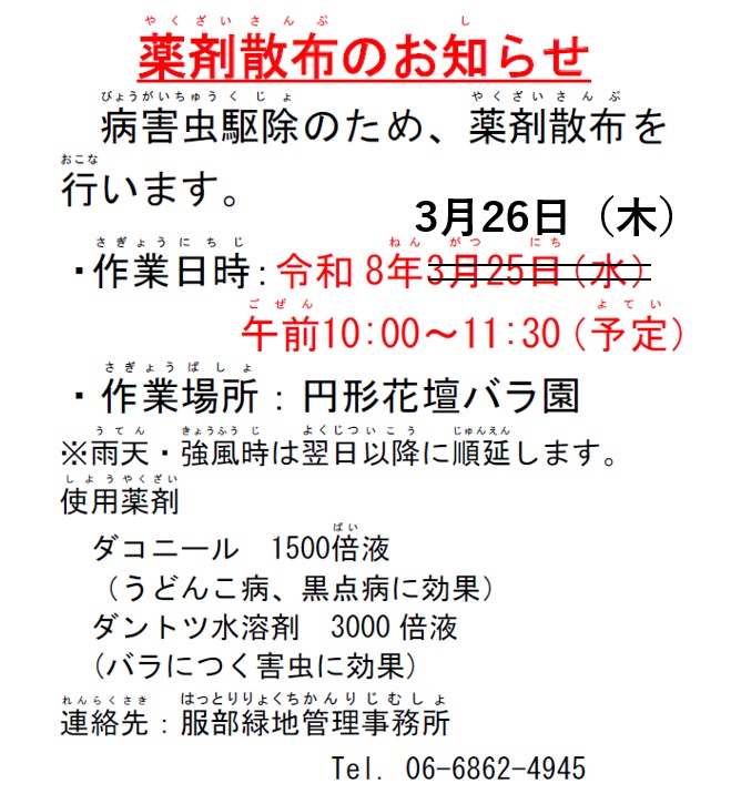 3月 円形花壇バラ園 薬剤散布日変更のお知らせ
