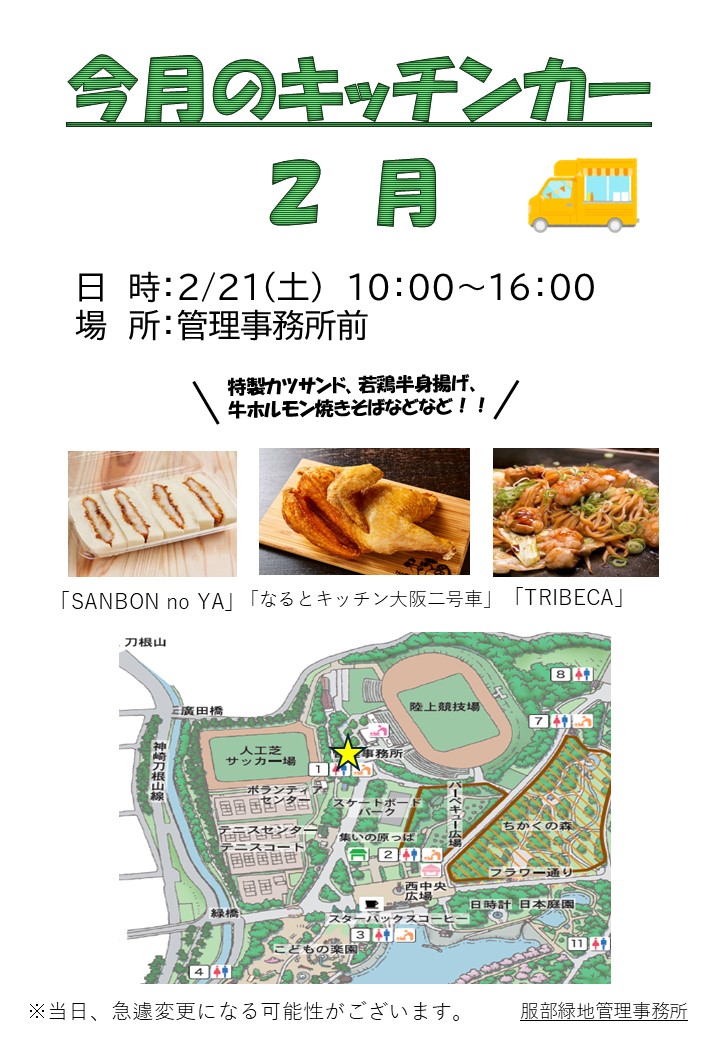 <2月キッチンカー出店のお知らせ> 管理事務所前 2/21(土) 10:00~16:00 ・SANBON no YA ・なるとキッチン大阪二号車 ・TRIBECA