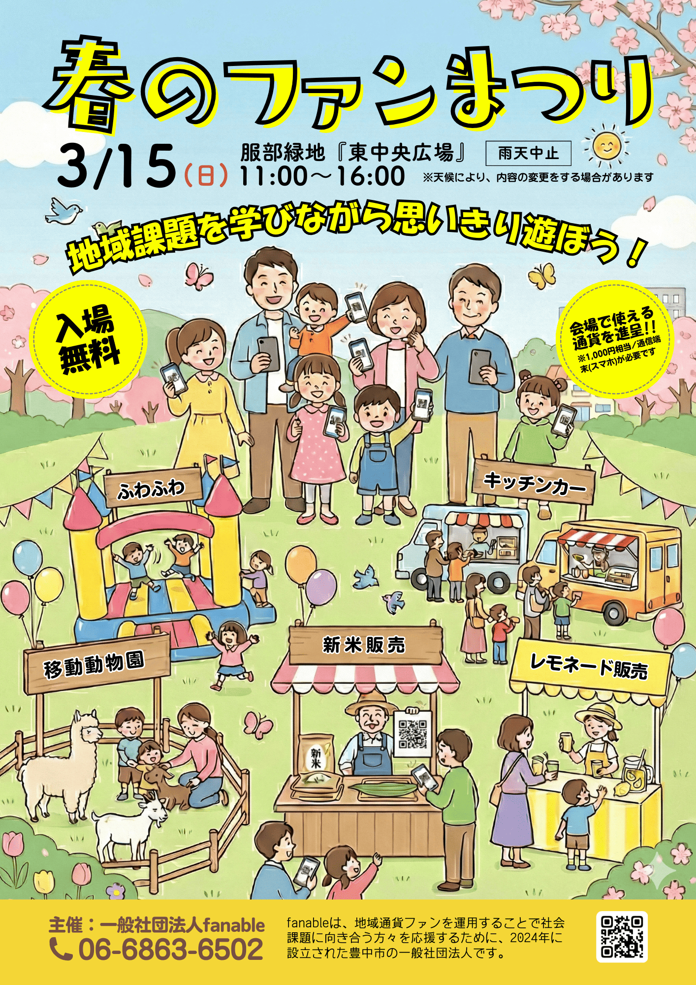 地域課題を学びながら思いきり遊ぼう!移動動物園、ふわふわ遊具、新米販売、キッチンカーなどが出店 日時:2026年3月15日(日)11:00~16:00場所:東中央広場お問合せ:一般社団法人fanable 06-6863-...