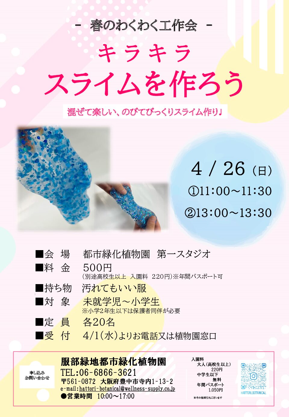 大人気のスライム工作会、 4月26日(日)都市緑化植物園で開催! ぷるぷるひんやり、カラフルなスライムを作ろう! 【日 時】4/26...