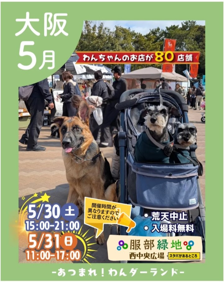 服部緑地 西中央広場にてペットのマルシェイベントを開催!🐶 わんちゃんのおやつやお洋服、キッチンカーなど約80店舗が大集合! 日程:5月30日(土)・31日(日) ※荒天中止時間:5/30 15:00~2...