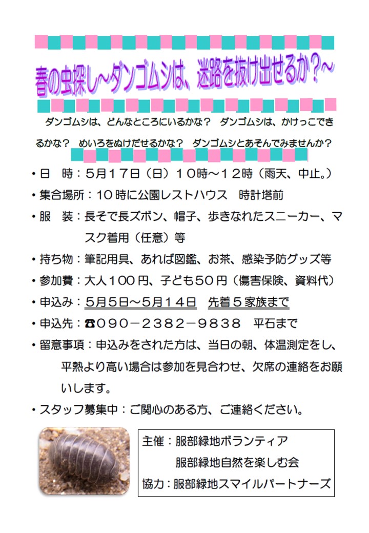 服部緑地ボランティア団体「自然を楽しむ会」主催のイベント情報!✨ダンゴムシはどんなところにいるかな?ダンゴムシはかけっこできるかな?迷路を抜け出せるかな?ダンゴムシと遊んでみませんか? 日 時:5月17日...