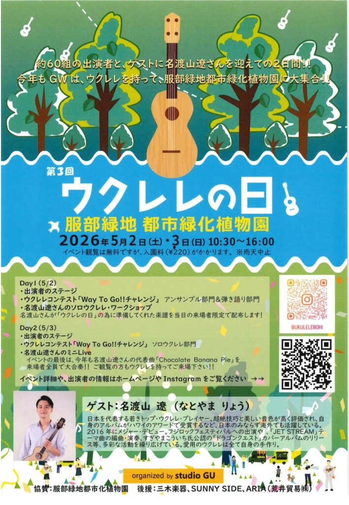 一般公募のウクレレ愛好家ステージと、ゲスト トップ・ウクレレ・プレーヤーの 名渡山遼さんのステージ。植物園でウクレレの音色を楽しむ一日です。