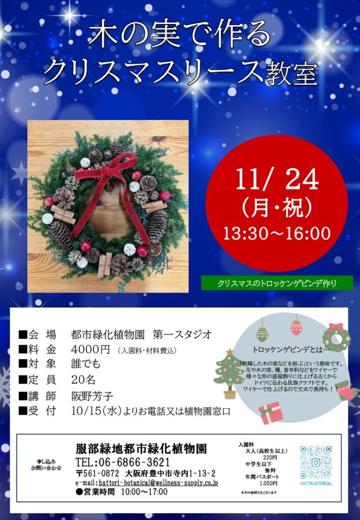 【日 時】 11月24日(月・祝日)                                                  【会 場】服部緑地都市緑化植物園 第一スタジオ                                       【参加費】4,000円(入園料込)                                                 【定 員】20名                                                      【対 象】誰でも(小学生以下保護者同伴必須