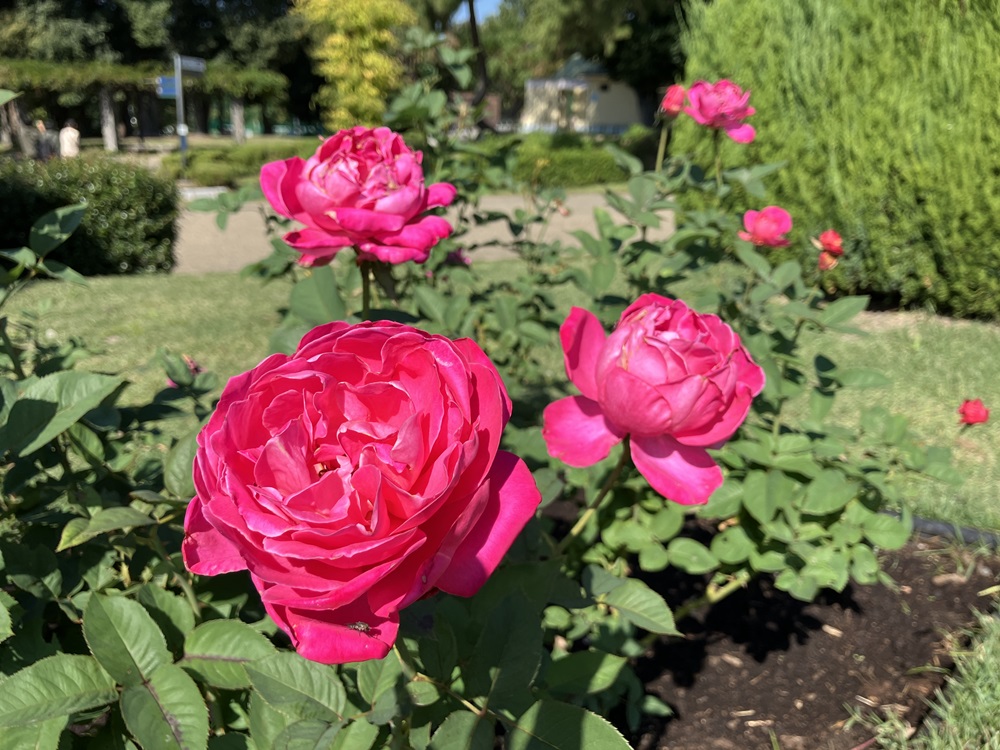 秋バラ・コスモスも見頃を迎える円形花壇で、美しいハーモニーをお楽しみください。