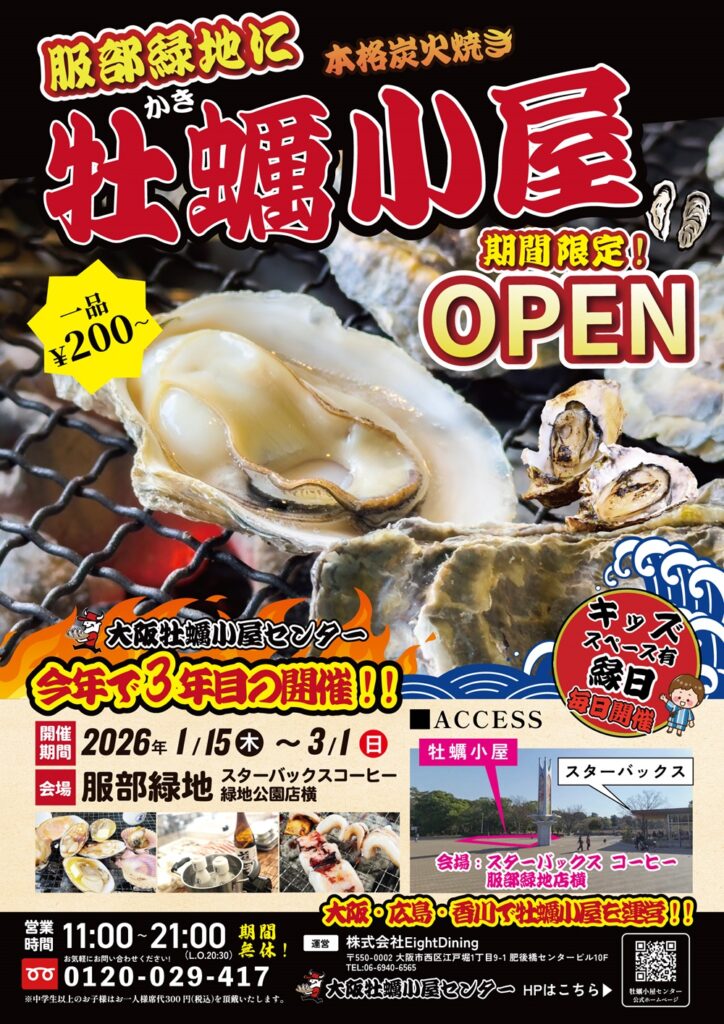 本格炭火焼き「大阪牡蠣小屋センター」が西中央広場に、期間限定でオープン予定!