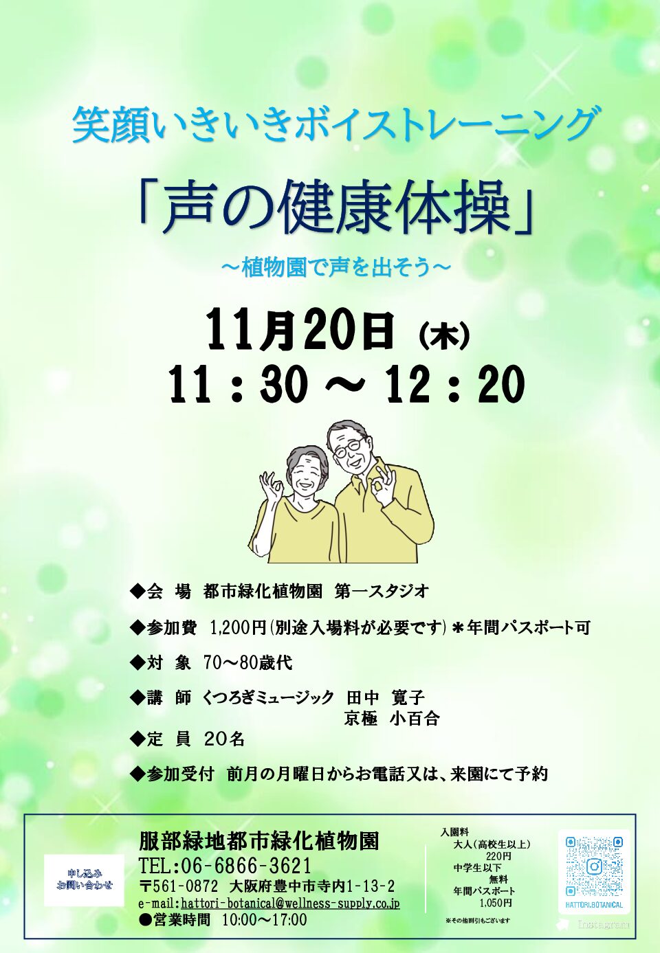70歳から始める声のトレーニング教室。 【日 時】 11月20日(木)11:30~12:20 【会 場】 都市緑化植物園 第一スタジオ 【参加費】 1,200円(但し、入園料220円が別途必要)※年間パスポート可 【講 ...