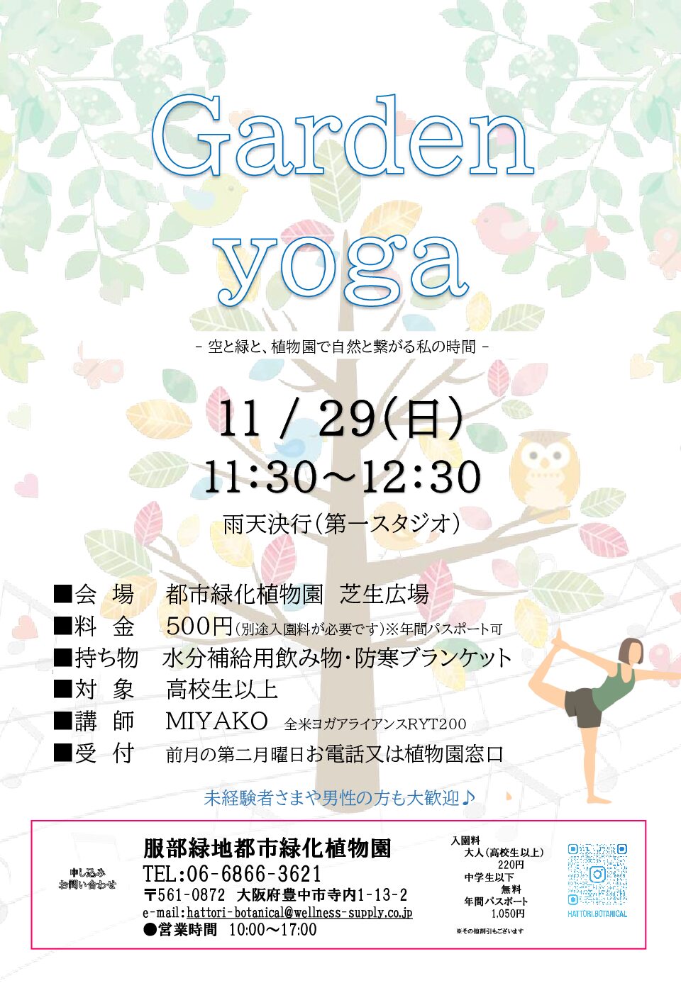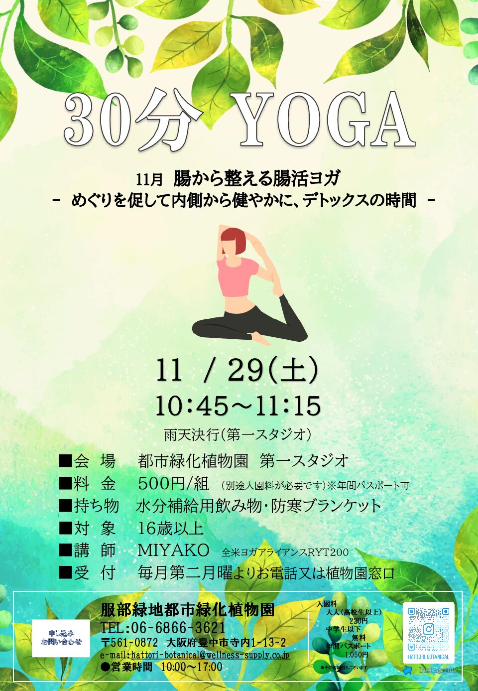 【日 時】 11月30日(日) 10:45~11:15 【会 場】 都市緑化植物園 芝生広場 【参加費】 500円(別途入園料)※年間パスポート可 【講 師】 MIYAKO氏 全米ヨガアライアンスRYT200 【持ち物】...