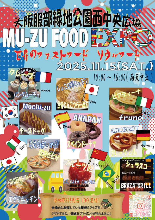 日時:11月15日(土)10:30~16:00 場所:西中央広場 主催:株式会社夢‘s ブレッチェル、チーズドッグ、ピザ、ナポリタンなど 世界のグルメが味わえるお店が10店舗集合!イートインスペースもあります!